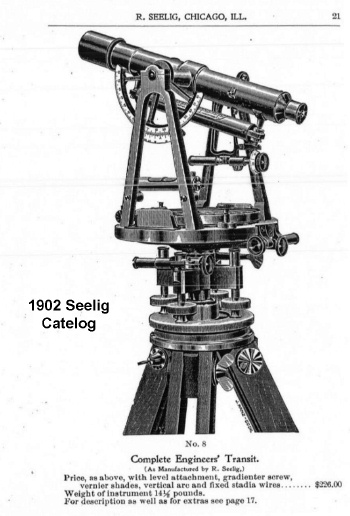 Telescope Length: 11-1/2" This instrument appears to be in good working condition. The telescope focuses and cross hairs are clear. All level bubbles are intact and the compass needle moves freely. The compass face is engraved "R. Seelig, Chicago". This indicates that the instrument was likely manufactured before 1905 when he brought his son into his business (see history below). The picture and description of the Complete Engineers Transit shown in the1902 Seelig catalog, p.21 (above), closely matches this transit. Instruments made after 1905 were likely engraved "Seelig and Son, Chicago" (e.g. this transit sold at a Worthpoint auction) Inside the door of the box is a label (see picture) titled "Pittsburg Instrument & Machine Company" - Pittsburg, Pennsylvania. They possibly could have sold the instrument or repaired it. On the outside top of the box is a tag (see picture) that indicates that the instrument was owned by "The Baltimore & Ohio Railroad Company" and was sent to "Buff & Buff Mfg" in 192?. Possibly this was being traded in for a new instrument. The instrument was obtained from Buff & Buff in 1967 by a collector and has been in climate controlled storage since then. Roman Seelig Instrument Maker (Adapted from Smart's "The Makers of Surveying Instruments in America since 1700" and The Compleat Surveyor): Known Business Entities: