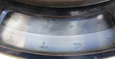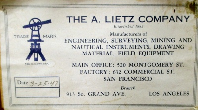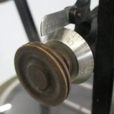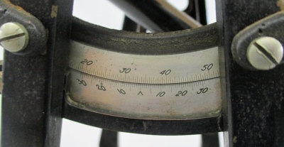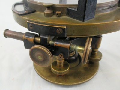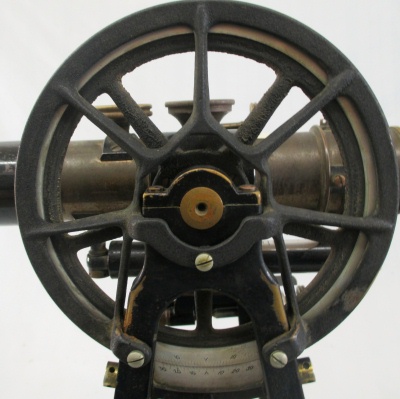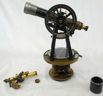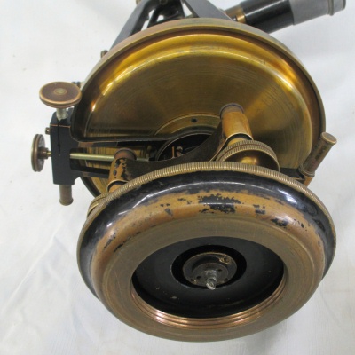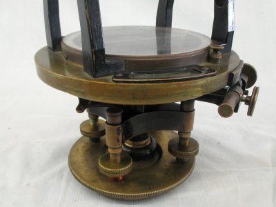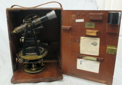 Transit Serial Number: 6640 Mount for Saegmuller Solar Attachment Telescope Length: 11-1/2" Diameter of Horizontal Circle: 7" Compass diameter: 5" Needle Length: 4-1/2" Diameter of Vertical Arc: 5" Height: 14-1/2" Weight: 17.8 lb Box: Yes (9"x13"x17") Condition: Good Found: Unknown location - likely acquired in the1960's CEH Inventory# T32 |
