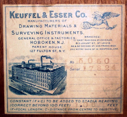 KEUFFEL & ESSER CO. (1867 - C) Hoboken, New Jersey Wilhelm J. D. Keuffel was born at Walbeck in Thuringen, Germany on July 21, 1838. He died in Hoboken on October 1, 1908. Herman Esser was born at Wuppertal-Elberfeld, Germany, 30 December 1945. He retired from Keuffel & Esser in 1902. He was back in Bad Godesberg am Rheim, Germany 23 April 1902. He died there 16 April 1908. Keuffel & Esser was founded July 19, 1867. It was incorporated in New Jersey on February 16, 1889. They first manufactured surveying instruments in 1885.