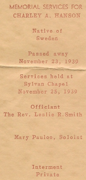 Sometime in 1922, the family moved to Los Angeles, initially living at 10906 South Main Street. Carl continued to work in San Francisco for awhile and when he got to Los Angeles he took a job as a cook for Red Stack Tugs operating out of San Pedro harbor, working there from May 17, 1923 to February 28, 1926 and again for a shorter period from September 1, 1926 to April 5, 1927. At some point they moved to 426 South Burlington Ave, which was listed in Carl's employment log book. In the 1930 census they were still at this location and Carl's occupation was listed as a janitor in an apartment house. Sometime in the early 1930's they moved to a house at 247 South Hoover Street. Carl is remembered by Norm as a very quiet person, but he wrote frequent and thoughtful letters to the children (Bill saved many of his letters and Glenyce has them). His penmanship was excellent - CLICK HERE to view a letter send on May 28, 1935 to son, Carl (Bill) and his wife, Harriet. The family moved to 10914 South Main Street prior to Carl's death. His health declined in the late 1930's and he died of a stroke on November 23, 1939 at the age of 72. |