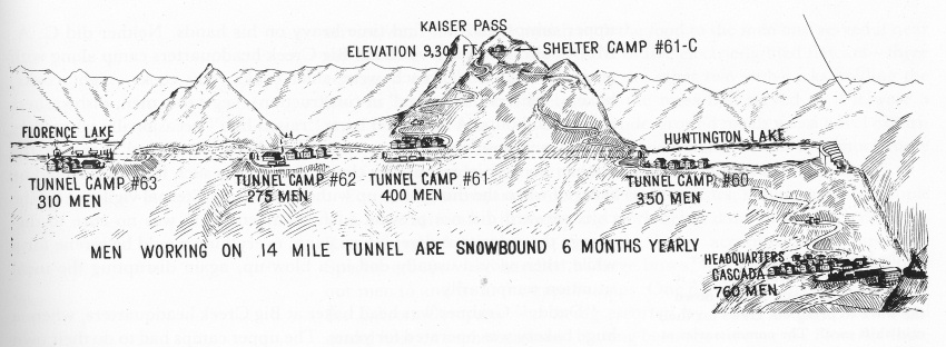 ![]() February 18, 1925 Florence Lake Tunnel Completion Tunnel crews and engineers at last break thru between Camps 62 and 63. This marked the end of the 13.2 mile long 15' bore through solid granite rock from Florence Lake to the portal at Huntington Lake. - Edison photo |