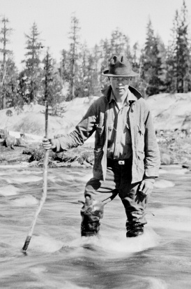 ![]() Cecil crossing the South Fork of the San Joaquin River on way to reservoir topographic mapping area. - CEH photo |