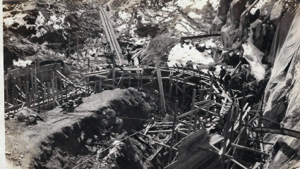 working until April when he returned home. Additions to the hydroelectric generating capacity continued to the late 1980's, including more dams and power plants. Today, the Big Creek project generates nearly 4 billion kilowatt hours per year, which is about 20% of Southern California Edison's total generation capacity and accounts for 12% of all the hydroelectric power produced in California. CLICK HERE for a map showing the overall system and various stages of construction. For a summary of the project from start to completion, CLICK HERE Below are some pictures he took or collected during