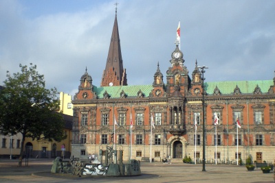 Stortorget (Great Square) - building is the Townhall (Radhuset) that was initially built in 1547. Behind it is the St Petri steeple. |