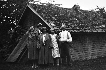![]() Gladys, Papa and Mama. Two on the right are probably part of the Jacobson family who lived next door. Mama's brother, Nels Jacobson (died 1927), and his family had a dairy business. |